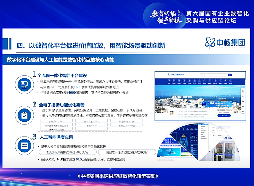 中國核工業(yè)集團有限公司經營管理部副主任劉萍進行了《系統(tǒng)性變革推動采購供應鏈升級,助力核工業(yè)高質量發(fā)展》主題分享。劉萍指出,核工業(yè)是國家安全的戰(zhàn)略基石,中核集團以“自主可控、數(shù)智賦能”為目標,構建了一體化智能管理體系,通過數(shù)字化技術提升采購決策的科學性和精準性,優(yōu)化供應鏈資源配置,實現(xiàn)了采購供應鏈的高效運作和風險管控,為核工業(yè)的高質量發(fā)展筑牢基礎。