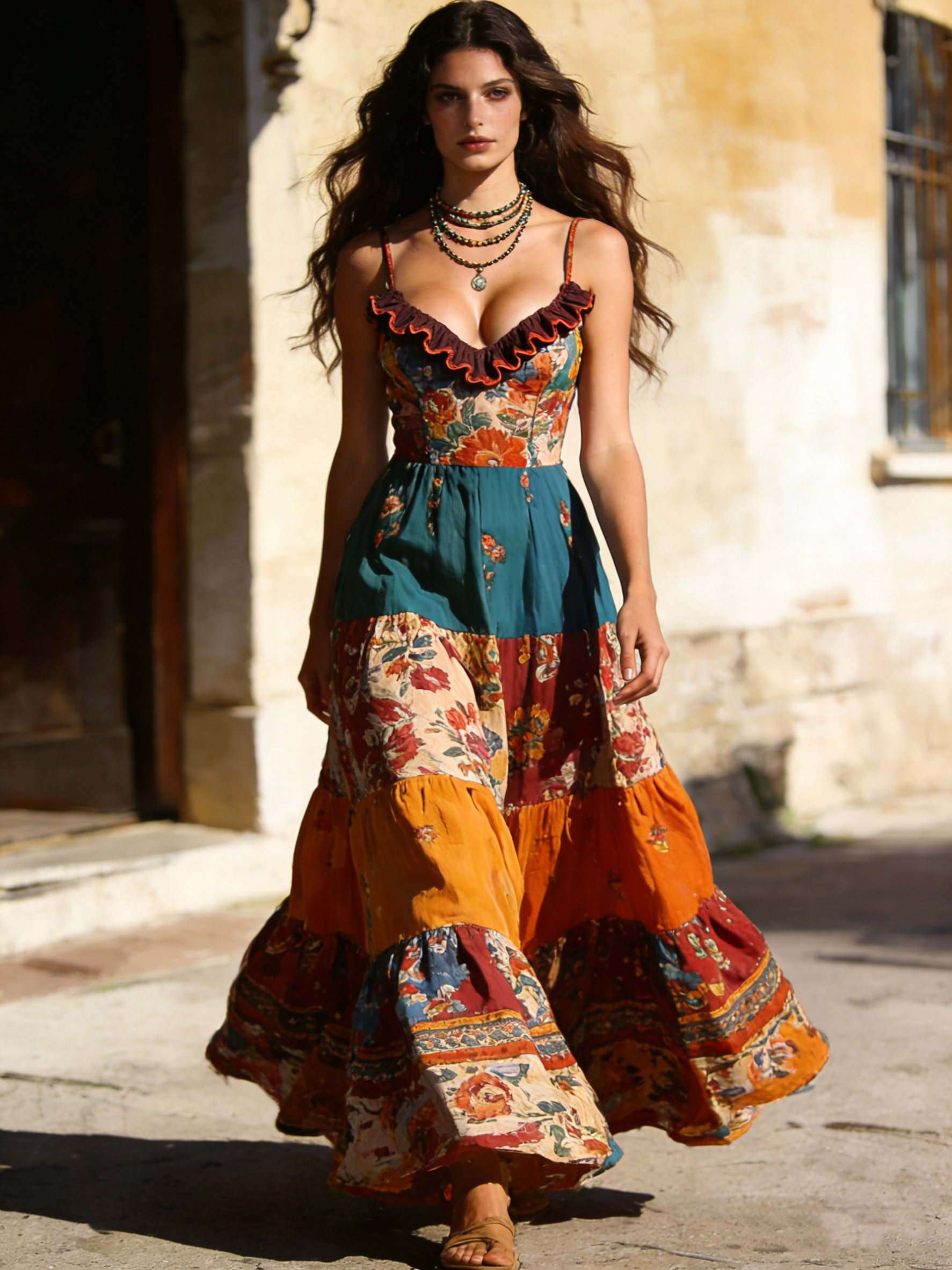 Women's Bohemian Print Spaghetti Strap Long Dress-0225