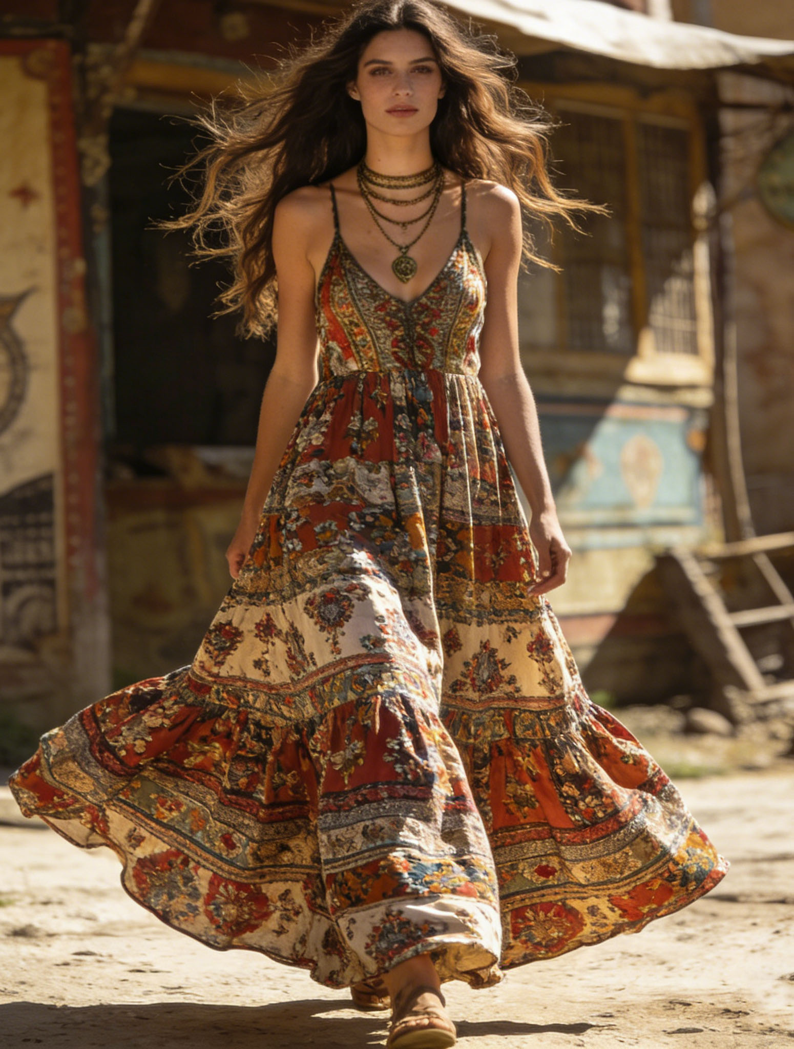 Women's Bohemian Print Spaghetti Strap Long Dress-0225